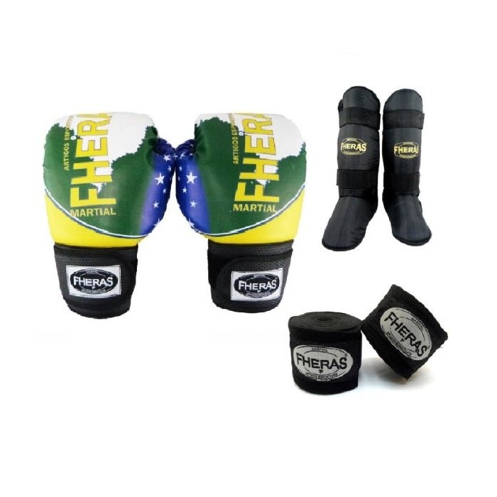 Kit Boxe Muay Thai Fheras New Top Luva+Band+Caneleira Free Bandeira Brasil 010