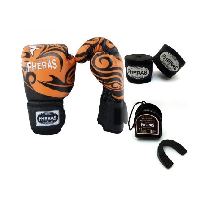 Kit Boxe Muay Thai Fheras New Top Luva + Bandagem Tribal Laranja 005