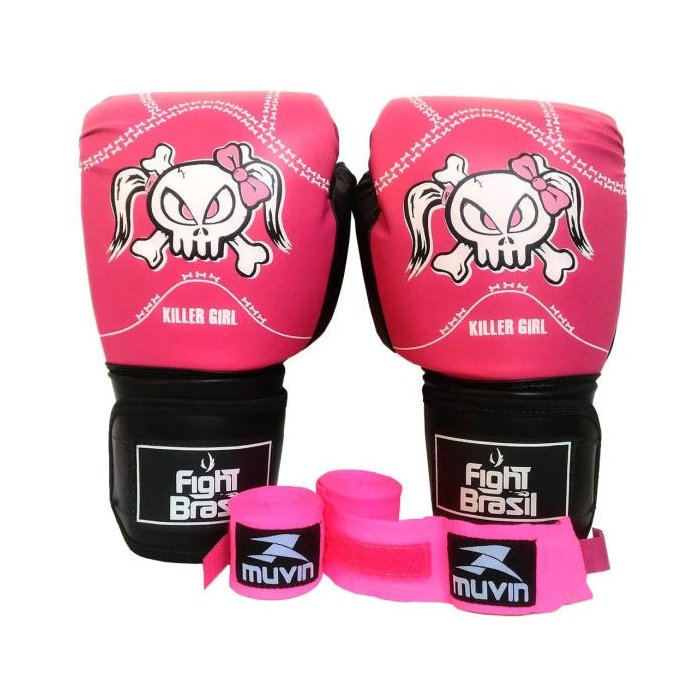 Kit Boxe Muay Thai Luva Bandagens Rosa 12 Oz Fight Brasil Feminino Mulheres.