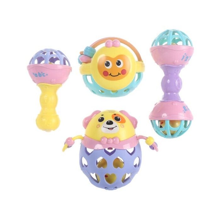 Um kit completo com 4 Chocalhos com formatos diferentes, sendo 2 com formato clássico, um cachorrinho e uma abelhinha.