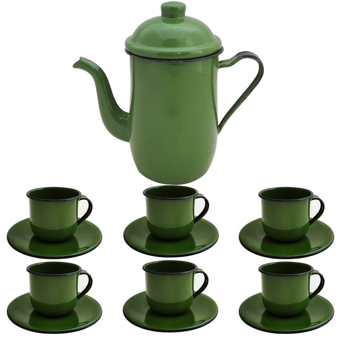 Kit Bule De Café E Chá Com 6 Xícaras e Pires Aço Esmaltado Verde Botânico Verde Botânico