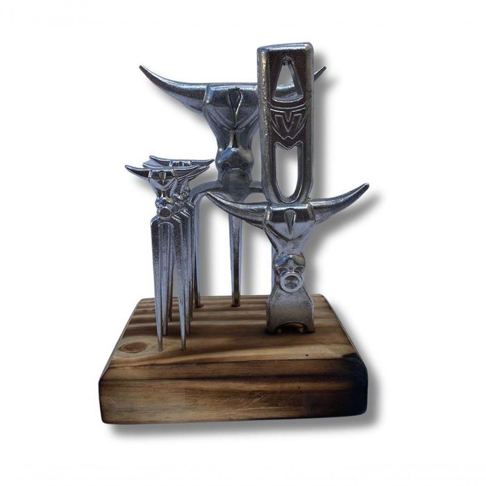 Kit Bull Tridente, Abridor de Cerveja, 3 Garfos e Suporte de Madeira Cinza