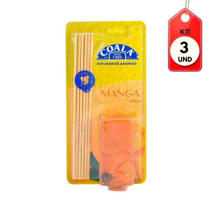 DESCRIÇÃO:Difusor de Aromas Manga Coala possui fragrância especial para deixar seu ambiente ainda mais perfumado e aproveitar todos os momentos marcantes. AÇÃO/ATIVOS:Sua fórmula suave deixa os ambientes perfumados e agradáveis por muito mais tempo. Imagem meramente ilustrativa. O produto pode ter variação de cor ou desenho, porém as características gerais são as mesmas especificadas na descrição do produto.MODO DE USAR:Desencaixe a tampa externa e abra o frasco retirando a tampa interna que veda o produto. Encaixe novamente a tampa externa no frasco. Introduza as varetas no frasco para que absorvam o perfume. Após 2 horas troque as varetas de lado.ESTE KIT CONTÉM: 03 UNIDADES DE COALA DIFUSOR DE AROMAS MANGA 100MLKit C/03 Coala Difusor de Aromas Manga 100ml