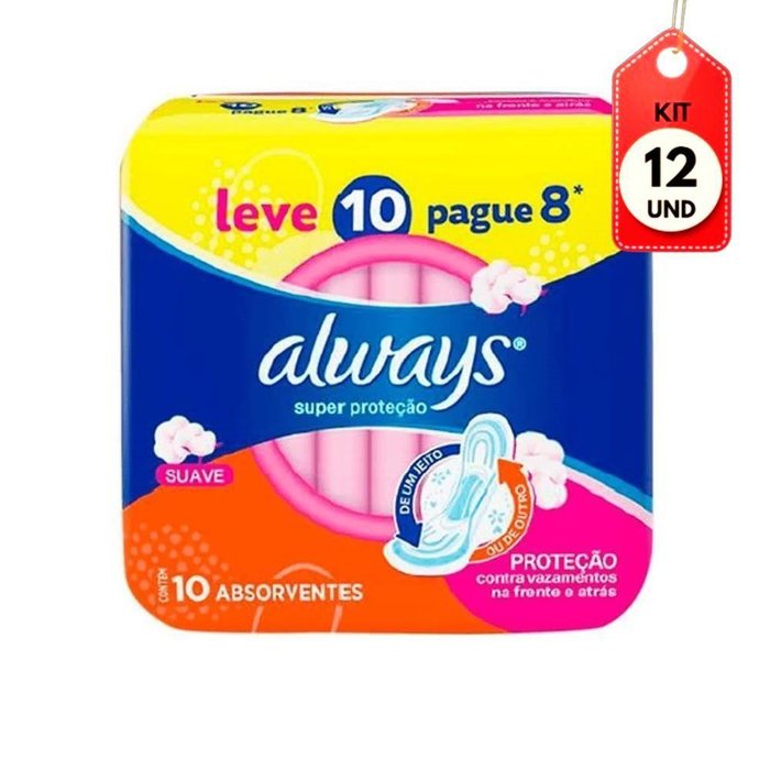 DESCRIÇÃO: Mais informações sobre o produto estão contidas no verso da embalagem. ESTE KIT CONTÉM: 12 UNIDADES DE ALWAYS SUPER PROTEÇÃO SUAVE C/ ABAS C/10Kit C/12 Always Super Proteção Suave C/ Abas C/10