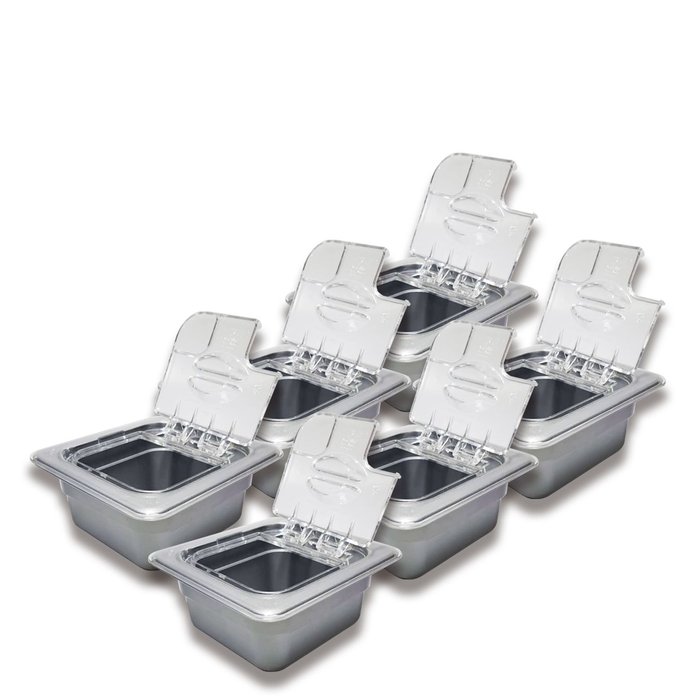 Cuba gastronômica, GN 1/6 x 65 mm, produzida em Copolímero E-A, com tampa com dobradiça.