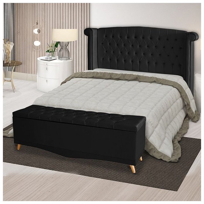 Kit Cabeceira de Cama Box e Calçadeira Baú Malibu Casal 140 Cm Suede Preto Eli Móveis
