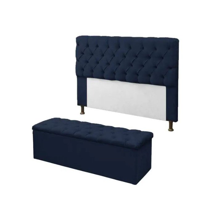 Kit Cabeceira e Calçadeira Baú Mirage Casal 140cm:Azul Marinho Azul Marinho