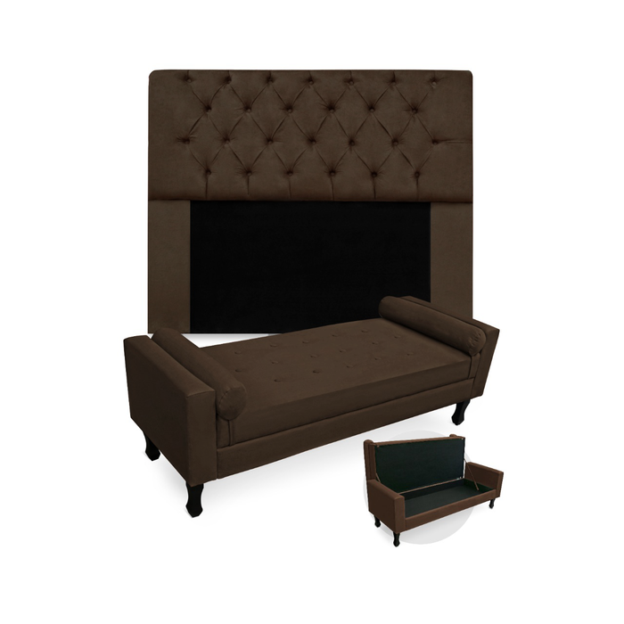 Kit Cabeceira Estofada Mirage E Recamier Baú Fenix Queen 160 cm Suede Marrom - LM DECOR