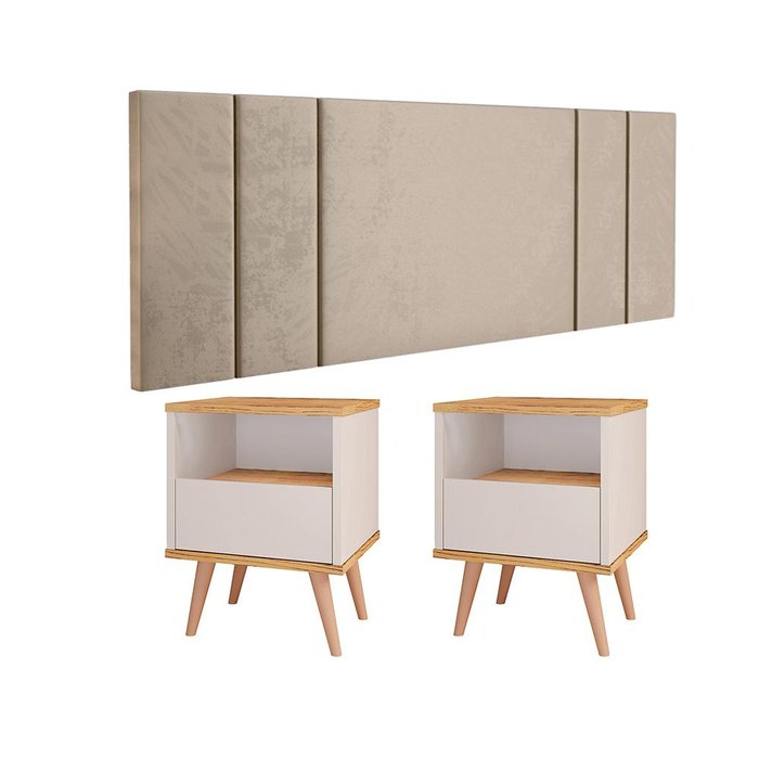 Kit Cabeceira Suspensa Parede Cama Casal Box 1,40 Bege e 2 Mesinhas Quarto Nicho e Gaveta – Off