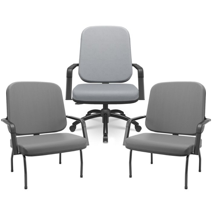 Cada peça combina um design moderno e robusto, projetado para atender às necessidades de pessoas sobrepeso, sem comprometer o estilo. As cadeiras fixas garantem estabilidade e apoio em momentos de conversa ou trabalho, enquanto a cadeira giratória oferece a liberdade de movimento e versatilidade, perfeita para dinâmicas de escritório. Todas com tapeçaria de alta densidade e acabamentos de qualidade, a fim de promover uma experiência de uso agradável e segura.