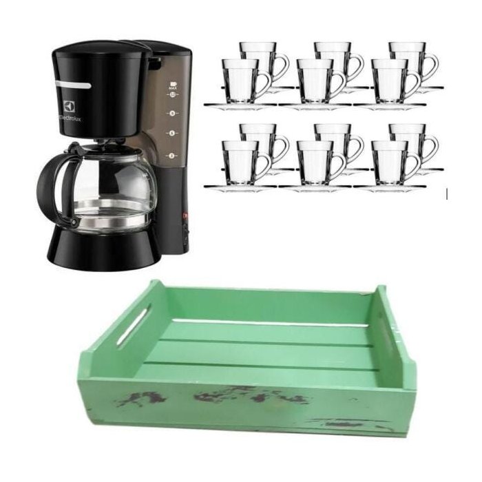 Conteúdo da Embalagem: 1 Cafeteira Electrolux Easyline 12 xicaras de café Preta 110V e 12 xícaras 12 pires e 1 Bandeja decorativa madeira
