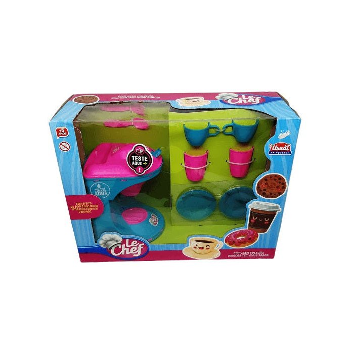 A coleção Le Chef ganha mais um eletrodoméstico para deixar a brincadeira mais saborosa. A cafeteira Le Chef tem compartimento para colocar água. Para montar uma linda cozinha de faz de conta!São diversos itens para colecionar e montar sua cozinha para brincar. A Cafeteira Le Chef vem com dispositivo eletrônico que faz barulho e acende a luz.