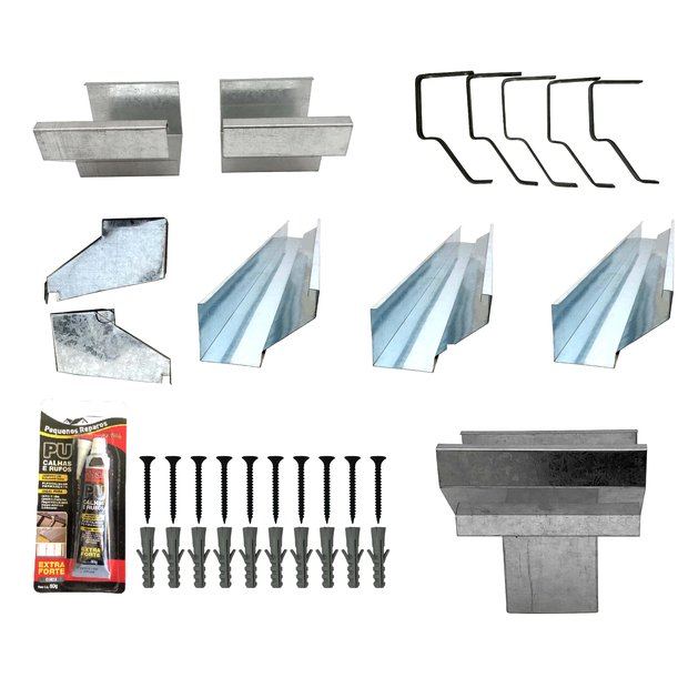 Kit contendo: 3 Calhas de Beiral Moldura corte 30 x 2 metros + 5 Suportes Calha de Beiral Moldura 30 externo + 2 Tampas de cabeceira Calha de Beiral Moldura 30 + 2 Emendas Calha de Beiral Moldura 30 + 1 Bocal Retangular 28 + 1 Bisnagas de PU de vedação 80g +10 buchas e parafusos para fixação
