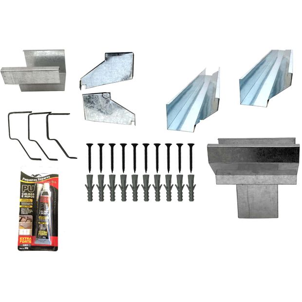 Kit contendo: 2 Calhas de Beiral Moldura corte 30 x 2 metros + 3 Suportes Calha de Beiral Moldura 30 externo + 2 Tampas de cabeceira Calha de Beiral Moldura 30 + 1 Emenda Calha de Beiral Moldura 30 + 1 Bocal Retangular 28 + 1 Bisnaga de PU de vedação 80g + 10 buchas e parafusos para fixação