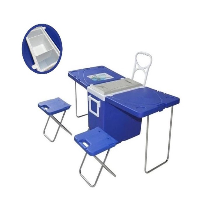 Este equipamento faz o papel de Caixa Térmica, Organizador, Mesa e Banquetas, além de ser transportado facilmente.