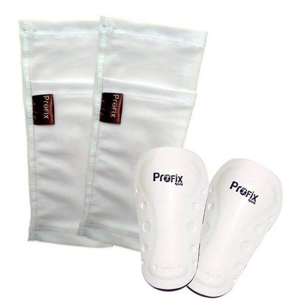 Embalagem contém: 01 Par de Caneleira Infantil Branca + 01 Par de Porta Caneleira Branca Profix.