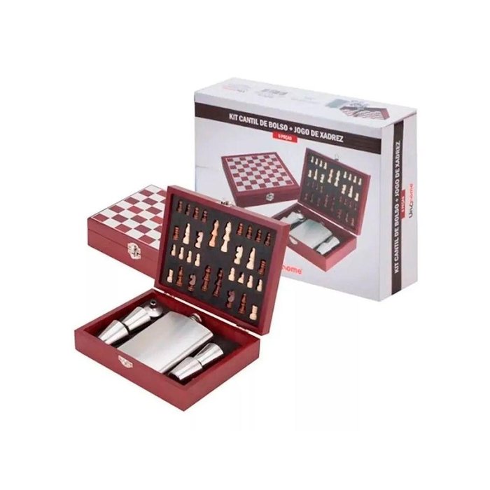 Quer impressionar seus amigos em um encontro descontraído? Adquira agora mesmo o Kit Cantil de Bolso com 6 Peças com Jogo de Xadrez UnyHome e faça sucesso!