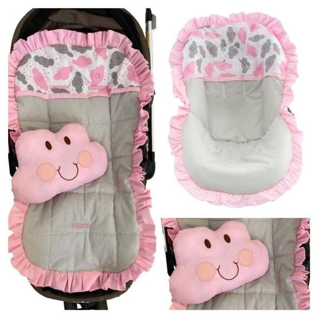Kit Capa de Carrinho + Capa Bebê Conforto Nuvens Cinza Rosa Cinza Rosa