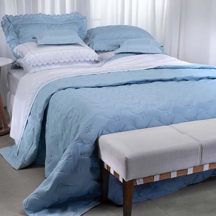 Kit casal 8 peças confeccionado em tecido percal 100% algodão, 200 fios. O modelo Garden nos brinda com aplicação de bordado de flores remetendo ao requinte e sofisticação. A colcha e a almofada levam enchimento manta leve 100% poliéster; acabamento matelassado e aplicação de bordado nas abas dos porta-travesseiros e das almofadas; O lençol com dobra feita e as fronhas também levam aplicação do bordado floral. O acabamentos bordado é especialidade da Marken Fassi. Conforto aliado a qualidade, Lumiére é mais uma linha de altíssimo nível dessa empresa que está à mais de 47 anos no mercado. Um toque de conforto e sofisticação que o seu quarto merece. Kit perfeito para a compor a cama! Foto meramente ilustrativa. Contém: 1 colcha 220x240cm 2 porta-travesseiros 50x70cm 2 almofadas 30x40cm 1 virol 220x240cm 2 fronhas 50x70cm INSTRUÇÕES DE LAVAGEM MARKEN FASSI • Lavar em temperatura de até 60°C. Processo suave; • Lavar com sabão neutro; • Não usar alvejante; • Não secar em tambor; • Passar até 110°C; Sobre os bordados passar até 80°C; • Não limpar a seco. Dicas de conservação Catran: - Siga as instruções de lavagem e conservação dispostas na etiqueta ou embalagem do produto.