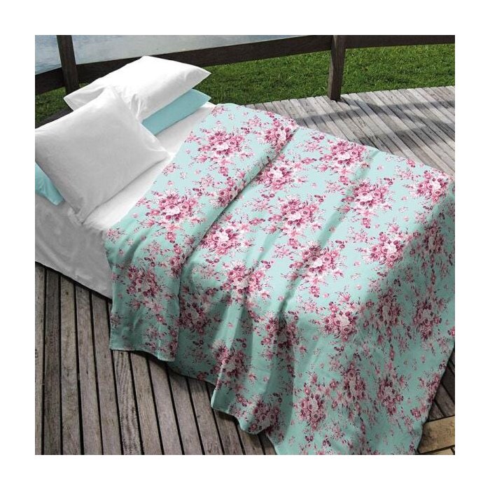 Tons da Colcha e Porta Travesseiro: Azul com estampas florais rosas