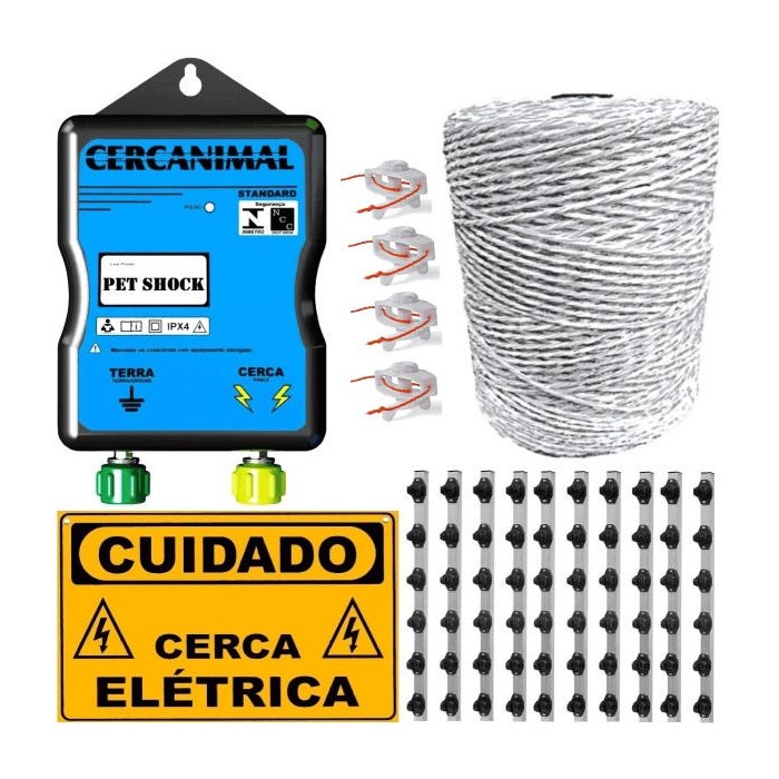 KIT CERCA ELÉTRICA CÃES E GATOS COMPLETO COM HASTES Este kit permite cercar uma área para que os cães, gatos ou outros animais pequenos não tenham acesso. O choque é apenas instrutivo, não vai machucar o seu animal. Equipamento regularizado conforme normas brasileiras. O KIT CONTÉM 01 Eletrificador pet shock bivolt automático 04 Catracas para esticar o fio eletro plástico 01 Rolo de fio eletro plástico de 500 metros 03 Placas de sinalização de cuidado 10 Hastes de 1,20 metros em alumínio com 6 isoladores cada OBSERVAÇÃO Caso não tenha conhecimento algum, entre em contato com o nosso técnico após a compra, ele poderá passar instruções de montagem e instalação. Você também pode contratar alguém de sua confiança para realizar o trabalho.