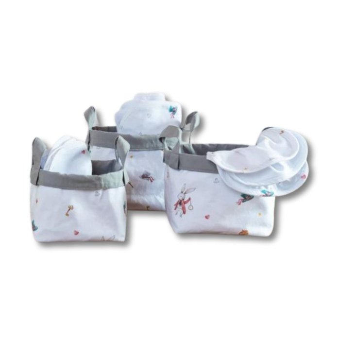 Nós entendemos que organização e praticidade é tudo, com isso temos esse lindo kit de cestinhas em malha orgânica com a estampa Alice.