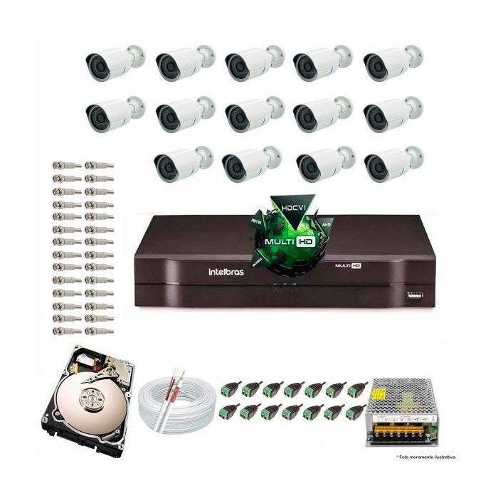 Kit Cftv 14 Câmeras 1.3MP 720p Dvr 16 Canais MHDX Intelbras 5 em 1 + HD 250GB O Kit Câmeras de Segurança Intelbras está pronto para ser instalado, ele contém todos os acessórios necessários. Recomendado para sua residência, comércio ou indústria, suas câmeras são ideais para instalação externa ou interna, feita com um material de alta qualidade, resistente a água e as diversas alterações do clima. Esse kit acompanha um DVR Stand Alone, aparelho perfeito para monitorar as câmeras instaladas de qualquer lugar do mundo, através do acesso pela internet, que pode ser feito pelo seu computador, laptop, tablet ou até mesmo de seu celular smartphone. A alimentação das câmeras fica por conta da fonte de energia de 12V que acompanha o kit, ela é suficiente para alimentar todas as câmeras, tanto durante o dia como durante a noite com os infravermelhos ligados. Perfeito para gravar as imagens capturadas pelas câmeras, o HD Sata irá ser instalado dentro do seu DVR Stand Alone, feito isso, você poderá usufruir além das imagens em tempo real, também as gravações armazenadas. Intelbras Multi HD® Com a nova linha de gravadores Intelbras Multi HD, o seu projeto ganha multi-possibilidades. Além da tecnologia Intelbras HDCVI, agora é possível utilizar as demais tecnologias*: AHD, HDTVI, analógica e IP * Compatível com AHD-M/H e HTVI 2.0 ou superior. Acesso remoto Com o Intelbras iSIC 6 para smartphones e o Intelbras S.I.M. Plus para desktops e notebooks, o gerenciamento das imagens pode ser realizado na própria empresa, ou de qualquer lugar, via internet. A qualidade da visualização remota das imagens dependerá da taxa de upload* do plano de internet contratado. ESPECIFICAÇÕES: DVR Stand Alone Multi HD Intelbras Os novos gravadores Intelbras Multi-HD® são compatíveis com os protocolos HDCVI, AHD*, HDTVI**, IP e Analógica. Características Compatível com 5 tecnologias: HDCVI + HDTVI 2.0 + AHD-M/H + Analógico + IP Visualização em 1080p Gravação de todos os canais em 1080N ou 720p Saídas de vídeo VGA, HDMI e BNC Reprodução em tempo real, detecção de movimento e busca avançada Compatibilidade com ONVIF Perfil S Suporta 1 HD SATA de até 8TB Edição de áudio e vídeo Modo NVR - Transforma todos os canais BNC em IP Função BNC + IP - Adiciona câmeras IP ao DVR IPv6 1 ano de garantia Descricao da Câmera: Resolução 1280x720p 1.3 Mega Lente: 1/3 de 3,6mm IR alcance: 30 metros Day Night LEDs: 36 Filtro:IR CUT Índice de proteção: IP 66 Material principal: Metal Disponível nas cores: Branca Íris: Eletrônico 1.3 Mega Pixel 720p Alimentação: 12 Volts, 1A Conector de sinal de vídeo: BNC Fêmea Conector de alimentação: P4 Fêmea Pode ser usado em ambiente externo e interno ITENS INCLUSOS: 01 - STAND ALONE DVR INTELBRAS MULT 16CH MHDX 1016 14 - CAMERA BULLET AHD JORTAN 6016 720P 1.3MP 3,6M 01 - CABO COAXIAL BIPOLAR FRAPA 4MM 2X26 80% MALHA 100 METROS 14 - CONECTOR P4 MACHO BORNE NEW PROTEC 28 - CONECTOR BNC MACHO MOLA PARAFUSO NEW PROTEC 01 - FONTE 12V 15A CHAVEADA NEW PROTEC 01 - PLACA SORRIA, VOCE ESTA SENDO FILMADO 01 - HD SATA3 250GB SEAGATE PIPELINE PUL ST3250312