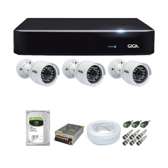Kit CFTV 3 Câmeras Segurança 4 Mega Pixel Giga GS0042 + Dvr 4 Canais 5 Mp Giga GS0190 + Acessó