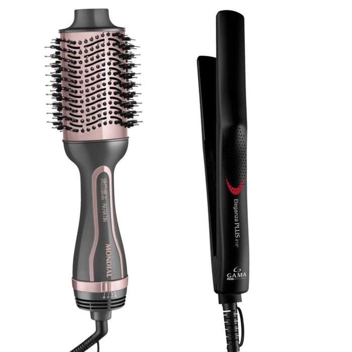 INCLUI: 1x Chapinha Profissional Prancha Alisadora GAMA Eleganza Plus Bivolt 1x Escova Secadora MONDIAL ES-11 Bivolt Chaveado Compre e use as melhores marca do mercado, com este conjunto GAMA e MONDIAL. Kit supercompleto que é para você que ama e cuida de seus cabelos. O Kit possui design ergonômico e superleve, permitindo cuide de seus cabelos com qualidade, podendo secar, modelar, fazer o peteando que quiser para o seu cabelo ficar magnifíco. A prancha Eleganza Plus possui potente resistência de cerâmica, oferece emissão de íons, que selam as cutículas do cabelo, mantendo a umidade natural dos fios, deixando-os muito mais brilhantes e sedosos, longe do temido efeito frizz. As cerdas mistas da Escova Mondial são flexíveis e com pontas arredondadas, para alinhar os fios, e cerdas menores de nylon, ideais para modelar o cabelo de acordo com o seu estilo. O Revestimento Cerâmico distribuiu uniformemente o calor, proporcionando uma maior proteção aos cabelos e rapidez para seca-los como preferir. PRATICIDADE PARA O DIA A DIA Prática e inovadora a Escova Secadora Grey Rose Keratin Mondial une o poder do secador à praticidade da escova. Conta com 1200W de potência e um fluxo de ar intenso para garantir uma secagem rápida enquanto alinha os fios. TECNOLOGIA A Escova Secadora Grey Rose Keratin Mondial possui gerador para emissão de Íons que reduzem o frizz e proporcionam maior brilho e maciez aos cabelos. Além disso, cerdas flexíveis que deslizam suavemente, desembaraçando e alinhando os fios sem danificá-los. FÁCIL DE USAR Selecione a temperatura desejada entre as 3 opções disponíveis e escove os cabelos úmidos da raiz até as pontas, repetindo o movimento até que os fios estejam secos. [CHAPINHA] CARACTERÍSTICAS - Modelo: Eleganza Plus - Tecnologia: Íon - Temperatura: 210°c TECNOLOGIAS - Thermal plus: O calor não ultrapasse o corpo do produto, mesmo em altas temperaturas, evitando queimaduras; - Ceramic ion: transmite altas temperaturas de forma rápida e constante. BENEFÍCIOS - Patins com revestimento cerâmico - Resistência de cerâmica: para cabelos mais brilhantes e sem o efeito frizz. - Acabamento em thermalplus - Cabo com alça para pendurar - Design que permite modelar cachos - Bivolt automático: funciona em qualquer lugar, sem se preocupar com a rede elétrica [CHAPINHA] ESPECIFICAÇÕES TÉCNICAS Voltagem/Tensão: Bivolt Modelo: Eleganza Plus Temperatura máxima: 210°C / 410°F Cor: Preto Tamanho do cabo: 1,80 metros Bivolt automático Cabo giratório: Não Dimensões do produto (cm): 2,5 x 4 x 24,5 Dimensões da embalagem (cm): 6,5 x 7,2 x 30 Peso do produto (kg): 0,241 Emissão de íons: SIM Emissão de ozônio: Não Certificação: INMETRO Número do certificado: 218.077/20 Organismo certificador: ABNT EAN: 7898496352030 Garantia de fábrica: 6 meses [CHAPINHA] CONTEÚDO DA EMBALAGEM 1x Prancha Eleganza Plus Bivolt [ESCOVA SECADORA] CARACTERÍSTICAS - 1200 W DE POTÊNCIA: potência de secador com fluxo de ar intenso para garantir uma secagem rápida. - 2 EM 1: Com o poder do secador unido à praticidade da escova, você seca e modela os cabelos ao mesmo tempo. - CABO GIRATÓRIO: gira 360° garantindo maior praticidade com total autonomia de movimentos durante o uso. - CERDAS FLEXÍVEIS: Cerdas macias que deslizam suavemente promovendo o alinhamento dos fios sem danificá-los. [ESCOVA SECADORA] ESPECIFICAÇÕES TÉCNICAS Voltagem/Tensão: Bivolt chaveado Largura: 11 cm Altura: 38 cm Profundidade: 9 cm Potência: 1200W Consumo: 1,2Kw/h Certificação: INMETRO Número do certificado: BRA20/01149 Organismo certificador: SGS EAN: 7899882314809 Garantia de fábrica: 12 Meses [ESCOVA SECADORA] CONTEÚDO DA EMBALAGEM 1x Escova Secadora Grey Rose Keratin Mondial ES-11 1x Manual de instruções