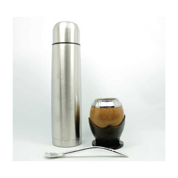 Kit Chimarrão Cuia Coquinho Uruguaio Natural Suporte Couro / Térmica 1 L / Bomba Curvada 19 cm