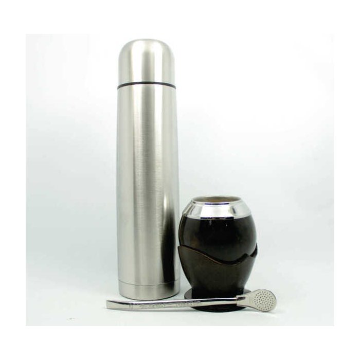 Kit Chimarrão Cuia Coquinho Uruguaio Preteado Suporte Couro / Térmica 1 L / Bomba Inox 19 cm
