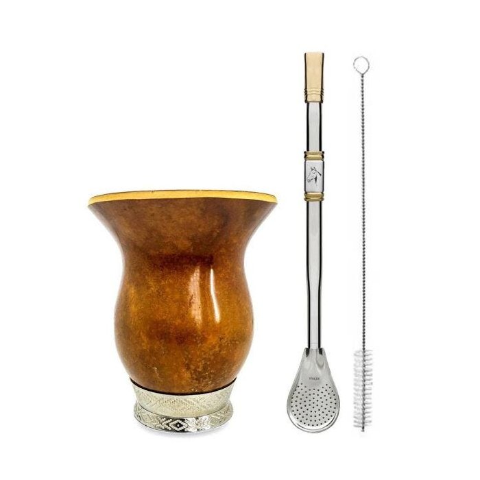 Kit Chimarrão Cuia Lisa Bocal Queimado Pé Metal + Bomba Inox Ouro Bojo 24cm