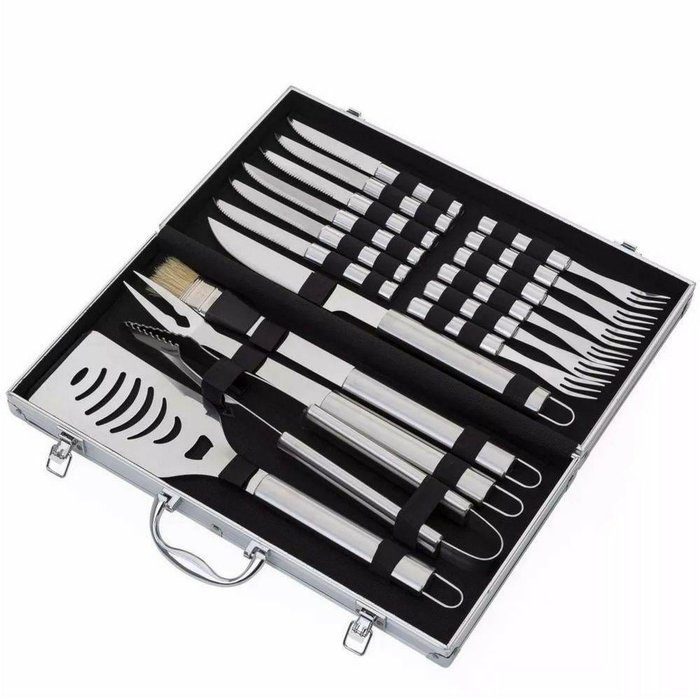 Uma verdadeira paixão do brasileiro é fazer o churrasco do final de semana com uma bela picanha .Esse Kit para churrasco é ideal para facilitar esse momento de descontração e lazer, tendo um lindo design e fino acabamento. São 17 peças todas em aço inox , com cabo escovado, alça para serem pendurados, tudo acondicionado em uma caixa de metal facilitando na organização e no transporte. As peças são compridas para maior conforto do usuário, ficando longe do calor do fogo durante o churrasco . Desfrute de momentos de grande felicidade com sua família e seus amigos. Um item indispensável para decoração ou presente.Contém:1 Espátula (acompanha protetor plástico)1 Pegador1 Pincel1 Garfo grande(acompanha protetor plástico)1 Faca grande(acompanha protetor plástico)6 Facas pequenas6 Garfos pequenos em inox.Detalhes em metal nas bordas da maleta, duas dobradiças na parte inferior, uma alça e duas presilhas para travar/abrir maleta. Parte interna revestida de tecido tnt e velcro para guardar as peças.Tamanho total aproximado (CxD):Maleta 47,5 cm x 25,3 cmEspátula 44,3 cm x 9,9 cmPegador 43 cm x 6 cmPincel 43 cm x 4 cmGarfo 43,7 cm x 3,5 cmFaca 42 cm x 3,4 cmFaca pequena 21,8 cm x 2,1 cmGarfo pequeno 20,7 cm x 2,5cmDicas para limpeza do aço inox:Água + detergente para uma limpeza rotineiraBicarbonato de sódio + álcool para a sujeira moderadaVinagre + bicarbonato + álcool para sujeiras pesadasBicarbonato de sódio + água para lustrar peças de inoxSolução com bicarbonato para tirar restos de alimentosDicas para conservar seu kit churrasco em inox:Nunca use palhas de aço para limpar inox, pois estas riscam a peça de forma irreversível.Limpe com frequência as peças de inox para que a sujeira e a gordura sejam retiradas com maior facilidade.Nunca use papel-alumínio para cobrir peças de inox.Sempre seque o inox, isso também é extremamente importante para evitar o aparecimento de manchas na superfície.Guarde os utensílios e/ou objetos de inox em local seguro e longe da poeira.