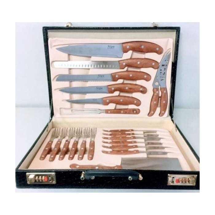 Kit Churrasco ou Cozinha Com Maleta 25 Peças em Aço Inox. Para ser um bom cozinheiro, você precisa não apenas de boas idéias, mas também de boas instalações. Se você sempre teve uma fraqueza por boa comida, esta é a ferramenta perfeita para missões culinárias de sucesso todos os dias. Esta bolsa contém uma infinidade de facas, picador, apontador e outros acessórios para várias refeições e alimentos para que você possa cozinhar como um chef em qualquer circunstância. Tudo o que você precisa agora é inovar para preparar verdadeiras iguarias e compartilhá-las com seus entes queridos. Conjunto inclui: Faca Chef 24cm Faca de Pão 20cm Faca de Carne 22cm Cleaver 16 cm Faca Universal 23cm Suporte de Forquilha 16cm Afiador 19cm Faca Entalhada 14cm Faca de Emparelhamento 10 cm Facas de Carne (6 peças) Garfos (6 peças) Tesoura de frango Tesouras Faca de Queijo Faca de Pizza Mala com trava de código.