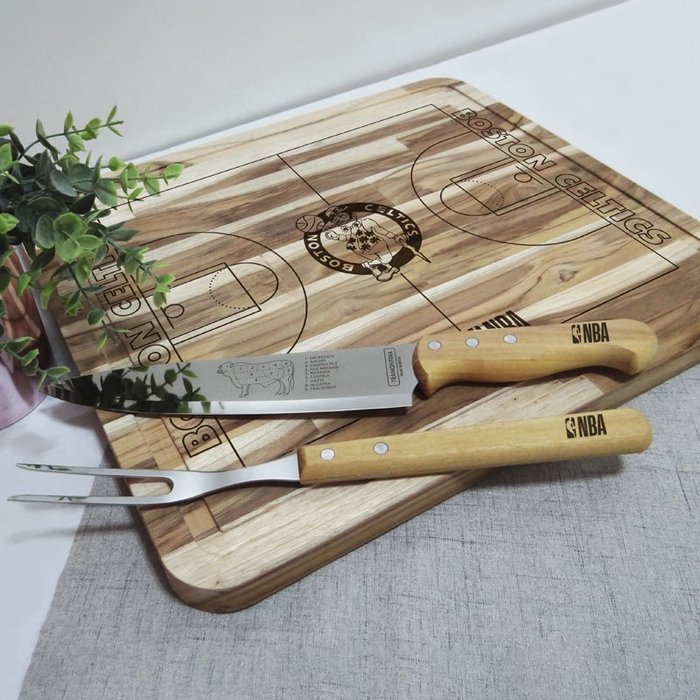 "O melhor produto para seu churrasco Produzido em madeira nobre maciça Teca, com gravação a laser, verniz atóxico, proteção antimicrobiana e antibacteriana, suas medidas são 41x36x2cm. O Kit Churrasco pesa 1,7kg, acompanha garfo e faca trinchantes, além de usar em seu churrasco é um grande presente. Para limpeza utilize sabão ou detergente neutro. O kit pode ter uma variação de cor por ser produzido com madeira natural. Garantia contra defeito de fabricação" Um produto Oficial homologado NBA Brasil