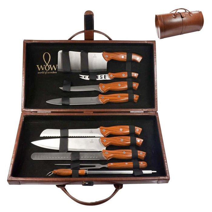 Itens produzidos em aço inox e maderia tacheada com maleta de couro marrom.