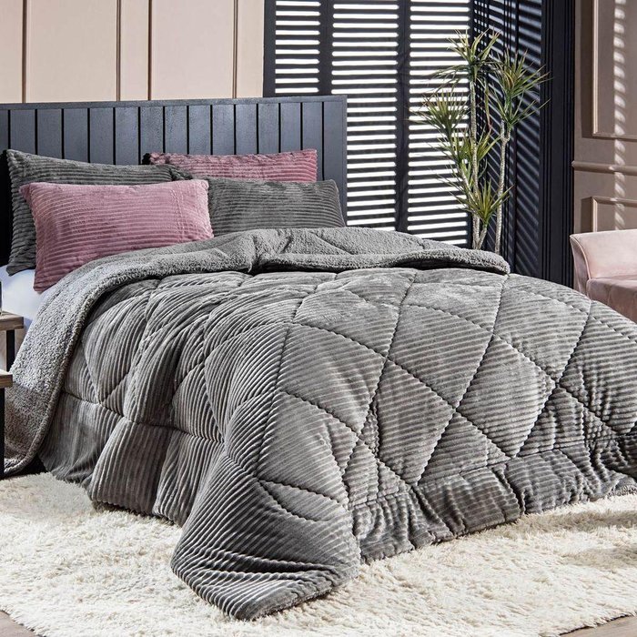 Kit Coberdrom Canelado Boston Casal Padrão 03pçs - Dupla Face Cinza
