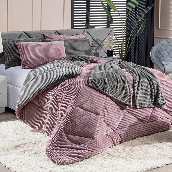 Kit Coberdrom Canelado Dupla Face Denver King 03 Peças - Manta Microfibra Canelada Cor Rosê