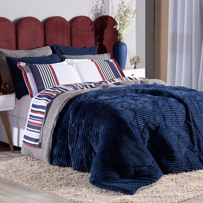 Kit Coberdrom Canelado Versalhes Azul Marinho King 03 Peças - Dupla Face Manta E Sherpa Colorida