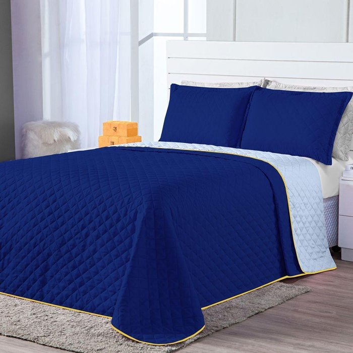 Kit Cobre Leito Azul Marinho Cinza Queen 03 Peças Dupla Face Única