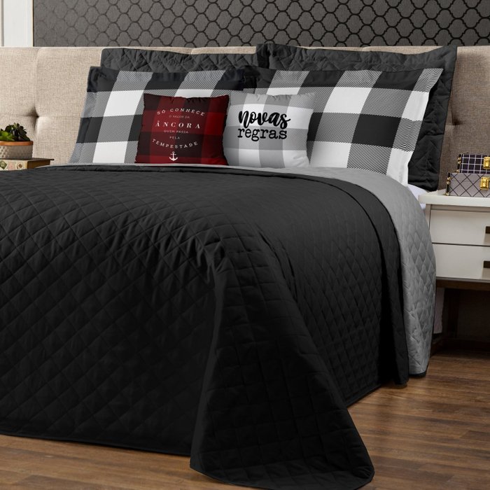 Kit Cobre Leito Casal 9 Peças Tecido Percal Dupla Face Xadrez Casaborda Preto