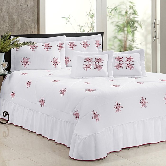 Kit Cobre Leito Casal King Berlim Bordado 07 Peças Branco c/ Vermelho