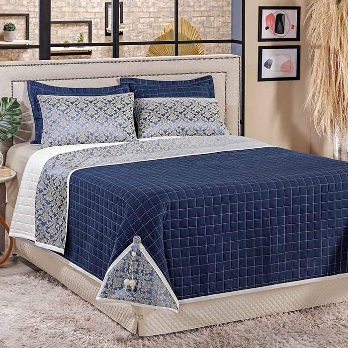 Kit Cobre Leito Colcha Luna Queen 07 Peças Dupla Face Micropercal 200 Fios Jacquard Pingentes - Azul