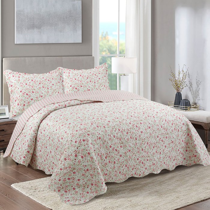 Kit Cobre Leito Colcha Mix Casal Padrão Estampado Dupla Face Floral 3 Peças - Lislie - Palha