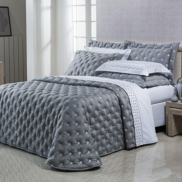 Kit Cobre Leito Colcha Super King 100% Algodão 400 Fios Acetinado Bordado 5 Peças Cinza Escuro
