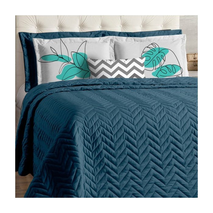 Kit Cobre Leito Havaí Queen Microfibra com Almofadas Florais 7 Peças - Azul Marinho