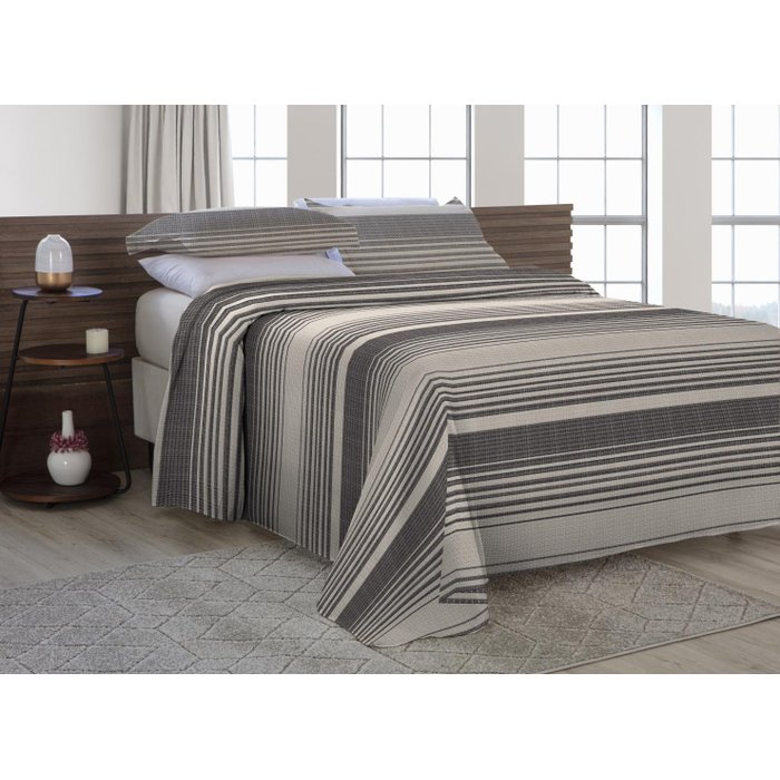 Kit Cobre Leito King Size Com Fronhas Em Piquet Algodão 3 Peças Listrado Preto e Palha