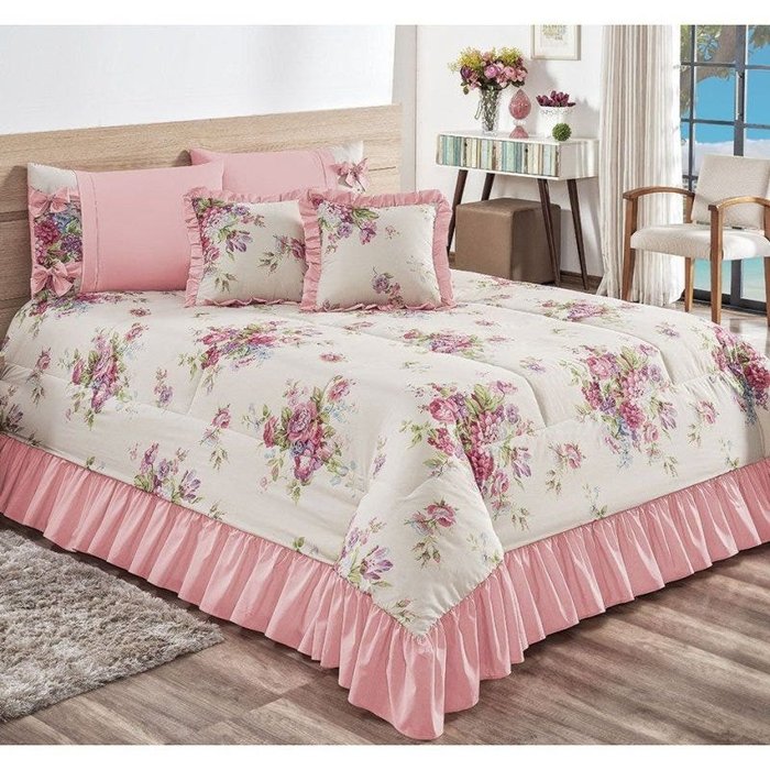 Kit Cobre Leito La Belle Casal King 07 Peças Confeccionado em tecido Percal 140 Fios Toque macio e confortável Cobre leito estampados com babado Porta travesseiros com detalhe estampado e laços Capas de almofada estampadas e com babados Refis de almofada siliconados super macio Contém na embalagem: 01 Cobre leito com babado 2,60m x 3,10m 02 Porta travesseiros 70cm x 50cm 02 Capas de almofada 45cm x 45cm 02 Refis de almofada 45cm x 45cm Composição: Tecido Superior: 80% Algodão / 20% Poliéster Manta: 100% Poliéster Tecido Inferior: 50% Algodão / 50% Poliéster