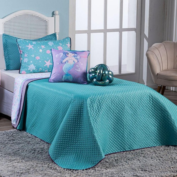 Confeccionado em tecido Microfibra Poliéster, a nova Coleção Sereia Tiffany vem trazendo um toque macio, com portas em acabamento debrum, o cobre leito com enchimento em manta dupla face, permitindo o uso dos dois lados (Tiffany e Lilás), tudo para combinar com a sua decoração! Acompanhando uma linda almofada de nó em malha furtacor com enchimento silicone e também uma capinha de almofada quadrada estampada digital com zíper. E para completar sua decoração, desenvolvemos os porta-travesseiros estampados em dupla face, podendo utilizar tanto o lado estampado Tiffany quanto o lado estampado Lilás, para montar a cama do seu jeito! Produzido num rigoroso controle de qualidade, dando um toque de requinte para o ambiente. Confira! Contém: 01 Cobre Leito Dupla Face 2,20m x 2,15m 02 Porta Travesseiros Matelados com Debrum (Tiffany) 70cm x 50cm 02 Porta Travesseiros Estampados Dupla Face com Viés 70cm x 50cm