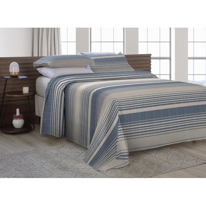 Kit Cobre Leito Solteiro Com Fronha 2 Peças Tecido Piquet Algodão Listrado Azul Marinho e Palha